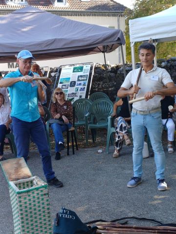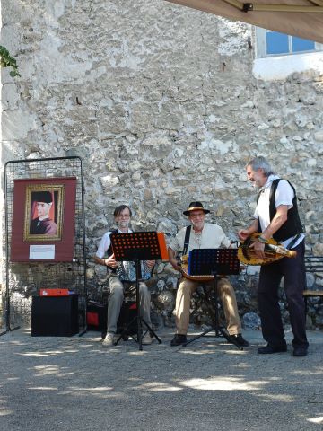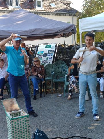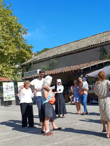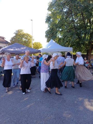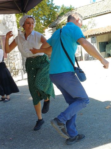 | L’après-midi le vent du sud s’était invité à la fête et malmenait notre exposition !!! Ce qui n’empêcha pas le groupe folklorique d’enchanter le public qui participa aux danses proposées. |