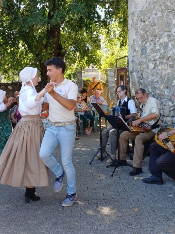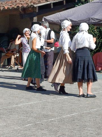 | Avant l’apéritif,servi sous le platane pour les visiteurs, la troupe folklorique «La Bise du Connest » nous avait divertis par ses danses et sa musique . |