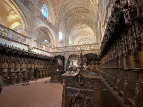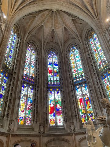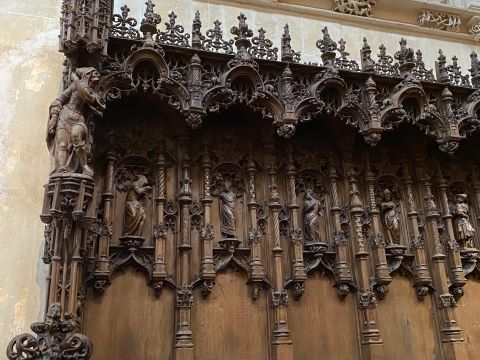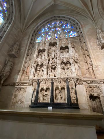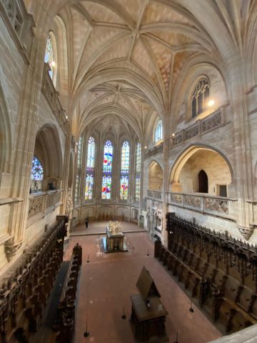| Nous verrons également un retable très rare, celui des Sept Joies de la Vierge Nous découvrons ensuite, les vitraux, le cloitre des moines et le cloitre des commis. |