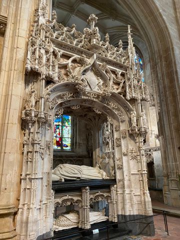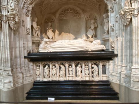 | Nous arrivons tout d’abord dans le cloitre des hôtes, où nous apercevrons les toitures étincelantes en tuile polychromes. Ensuite nous entrons dans l’église Saint Nicolas de Tolentin avec sa nef, son jubé qui sépare la nef du chœur en gothique flamboyant où on retrouve les lettres entrelacées P et M. (Philippe et Marguerite liées par des lacs d’amour.) Nous passerons ensuite sous le Jubé pour entrer dans le chœur ou se trouve trois tombeaux princiersMarguerite de Bourgogne, son époux Philippe le Beau et Marguerite de Bourbon mère de Philippe. Ces tombeaux sont somptueux, de la véritable dentelle en marbre noir, marbre blanc et toutes les sculptures en calcaire blanc de la Bresse |
